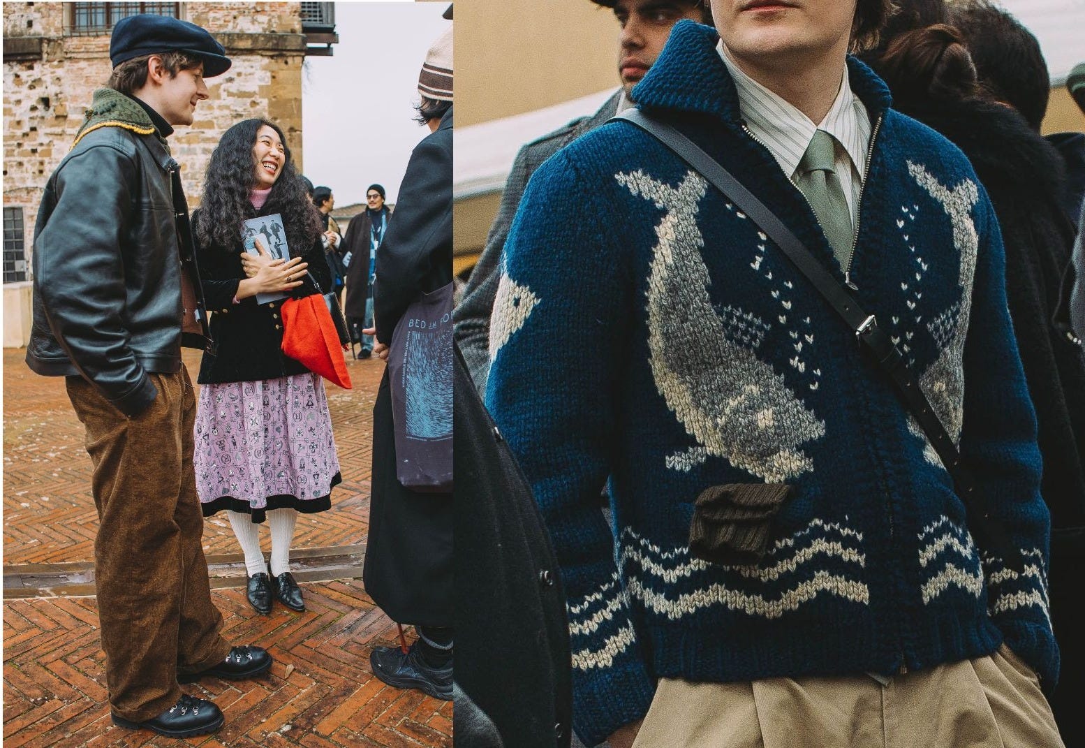 I found dressing for Pitti much more intimidating than dressing for fashion week in Paris or Tokyo, because it’s cliquey in a way that is so visible—you’re either a Pitti Peacock or you’re not. People make an insane amount of effort that borders on costume (mostly in a good way!) and that can be scary. But, crucially, the vibe at Pitti is not an elitist fashion vibe—it’s a nerdy vibe! Everyone’s just there to dress up, take a billion photos, and geek out about each other’s clothes. The most harmless of harmless fun. I managed to get through it mostly in my horse leather jacket from T.T, and this insane whale zip-up shawl collar sweater that I found at Suntrap in Koenji.